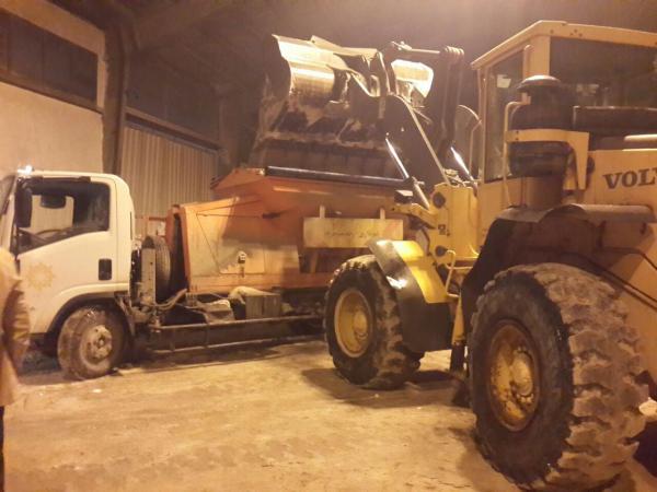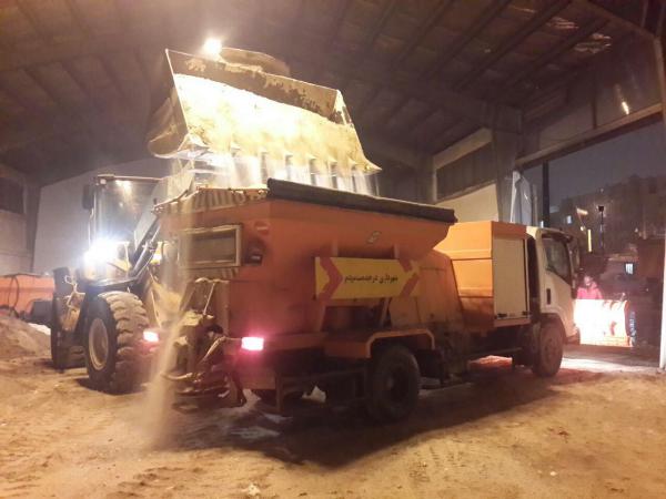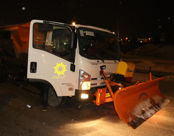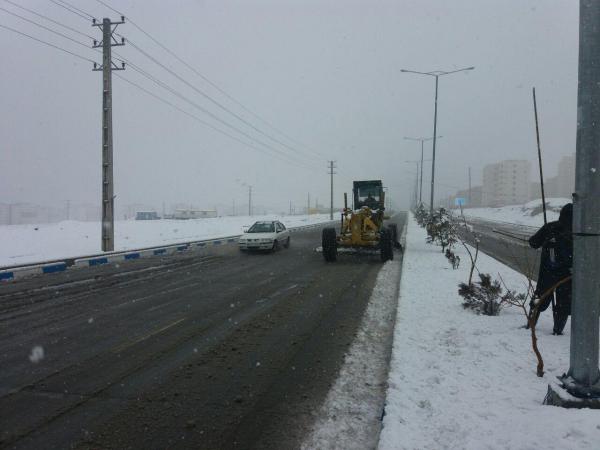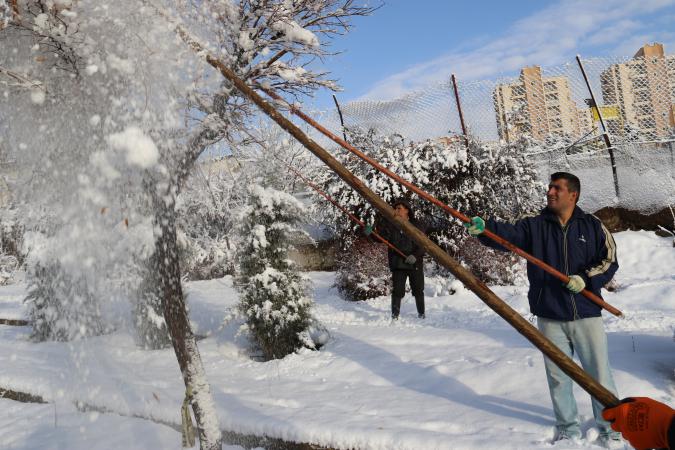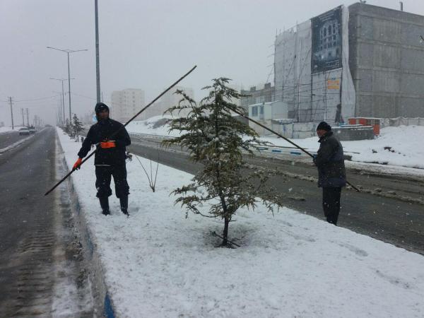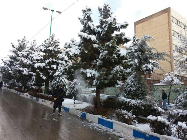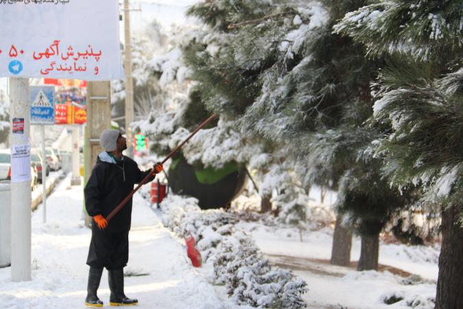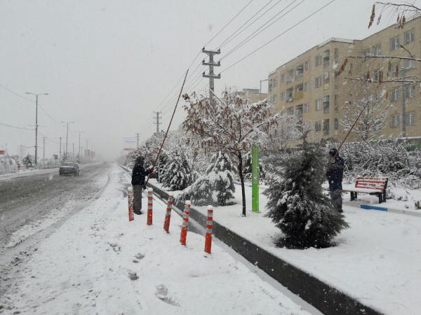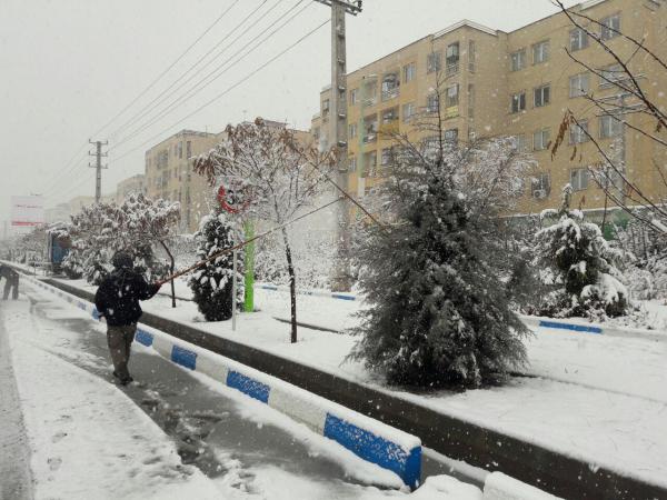 تلاش سبزبانان شهرداری شهر پردیس در رفع سنگینی برف درختان و برفروبی در شهر پردیس در زیر نمایش داده شده است.