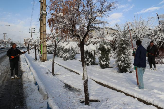تلاش سبزبانان شهرداری شهر پردیس در رفع سنگینی برف درختان و برفروبی در شهر پردیس در زیر نمایش داده شده است.